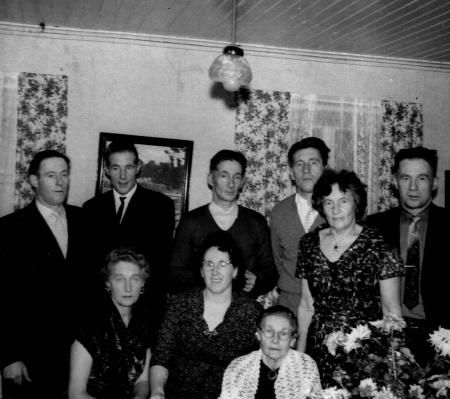 Foto taget på Matilda Burmans 80-årsdag. tillsammans med barnen. Överst fr.v: Levi, Felix, Alexander, Erik, Helmi, Evert. Nedanför: Lydia och Vivi. Helmi och Lydia bosatta i Amerika, alla andra boende i Koskö.