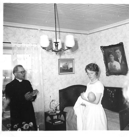 Margareta Wikström (Johansson) håller Bjarne och khde Åke Berman skall döpa.