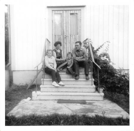Fr.v: Viola, Vivi, Elis, Verner Björk sittande på trappan vid sitt hus, som är nr. 74 A.