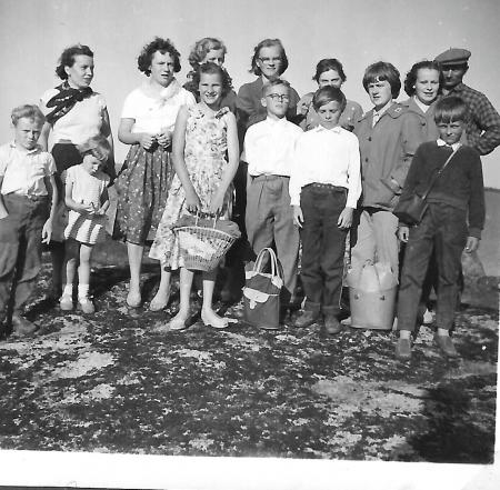 Fr.v: Bo-Erik Granlund, Aili Granlund, Gunborg Granlund (Östman), Seidi Burman (skymd), Ulla Stoor (Valli, med korg), Ann-Marie Mörk (Lundström), Berit Stoor (Ek), Bigitta Krus (Fochsell), Iris Nygård (Håkans), Arvid Burman (med mössa) Christer Mörk. I vita skjortor; Kaj Krus och ???