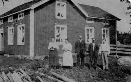 Fr.v: Okänd, Matilda Burman (Maalaks Tilda), Karl Albert Burman (Maalaks-Albärt), Edvard Eriksson (Laksis Iedvart), Emil Frants (AaLos Iemel). Stugan flyttad till "Maalaksendan" och är idag det hus som Ann-Catrin Stoor bor i.