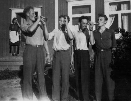 Fr.v: Knut Nygård, Uno Nygård, Ivar Snickars, okänd. Foto taget vid Albert och Irene Nygård, hus nr 126A i Kosköboken.