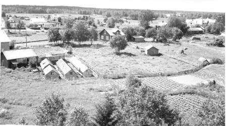 Till vänster "Lillstobakk". Burmans Snickeri, i mitten av bilden, hus nr 129 i Kosköboken, Samlingshuset längst till höger.