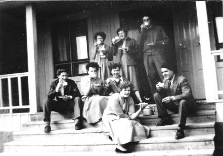 Sittande fr.v: Åke Tast, OKÄND, Anita Mörk (Nieminen), Alice Burman (Sandelin), Bertel Strandén. Stående fr.v: Gunnel Snickars (Paxal), Etel Nygård (Holmlund), Göran Frants.