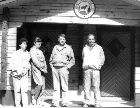 Foto taget vid första slakthuset, 08.08.1993. Fr.V: Siv EMörk, Alice Sandelin, Alf Burman, Karl-Erik Österberg.